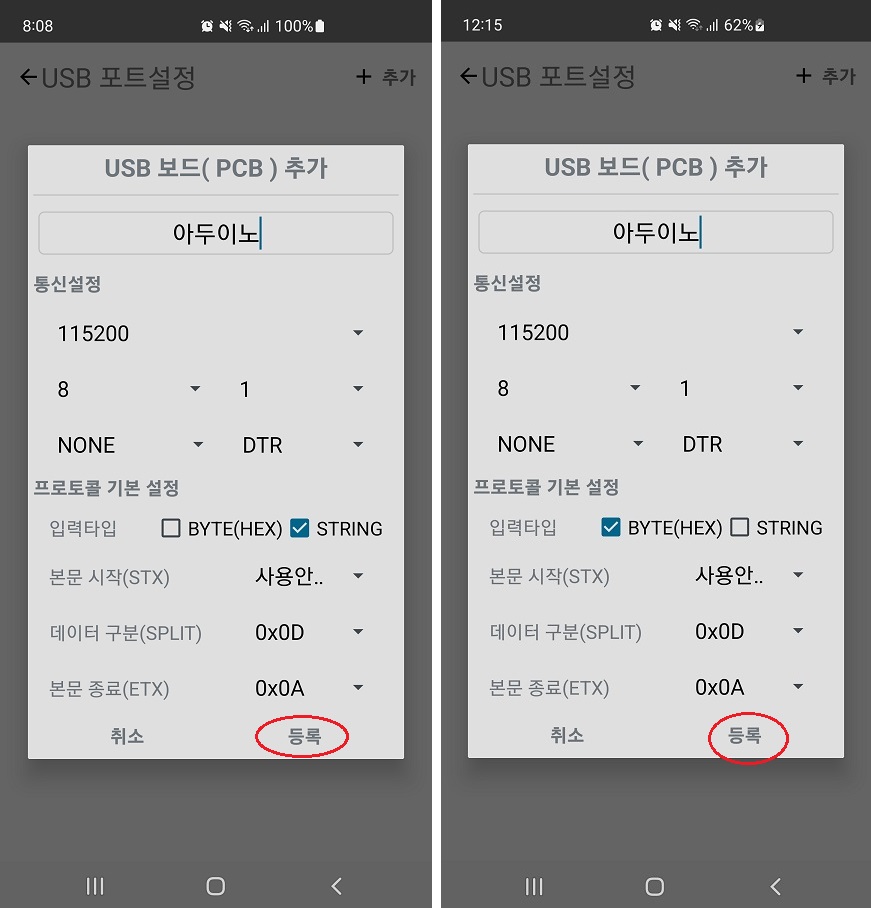 ☆ 아래 코드는 BYTE(HEX) , STRING 모두 동일하게 정상 동작합니다