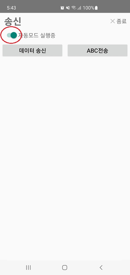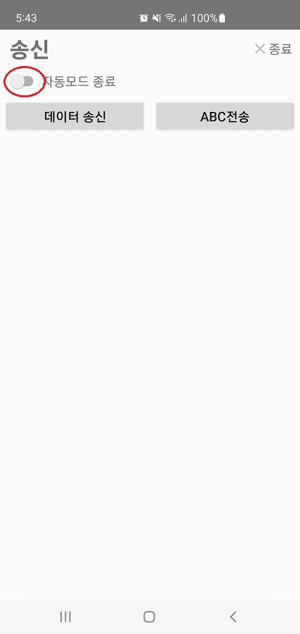 2. 자동모드 종료하기 ( IOT 코아 실행 화면 상단에 위치한 "자동모드" 토글 버튼을 "OFF" 합니다 )