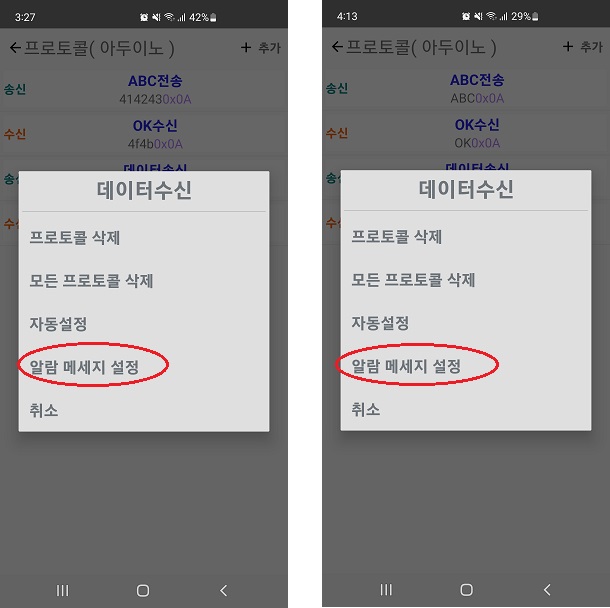 ★ [IOT 코아] 버전 1.0.0 에서는 "송신" 프로토콜에 대해서 "알람 메세지"를 지원하지 않습니다.