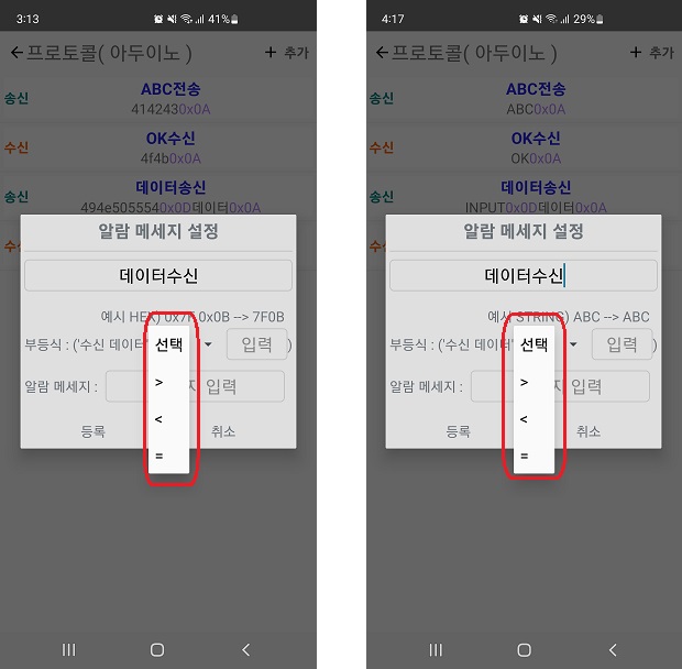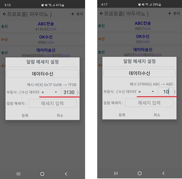 ○ "부등식" : "수신" 데이터 값이 입력 값( 10 ) 같다면.