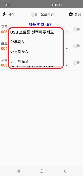 7. "USB 포트를 선택해주세요" 스피너를 선택합니다