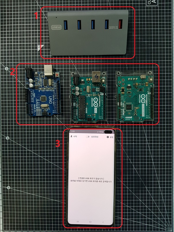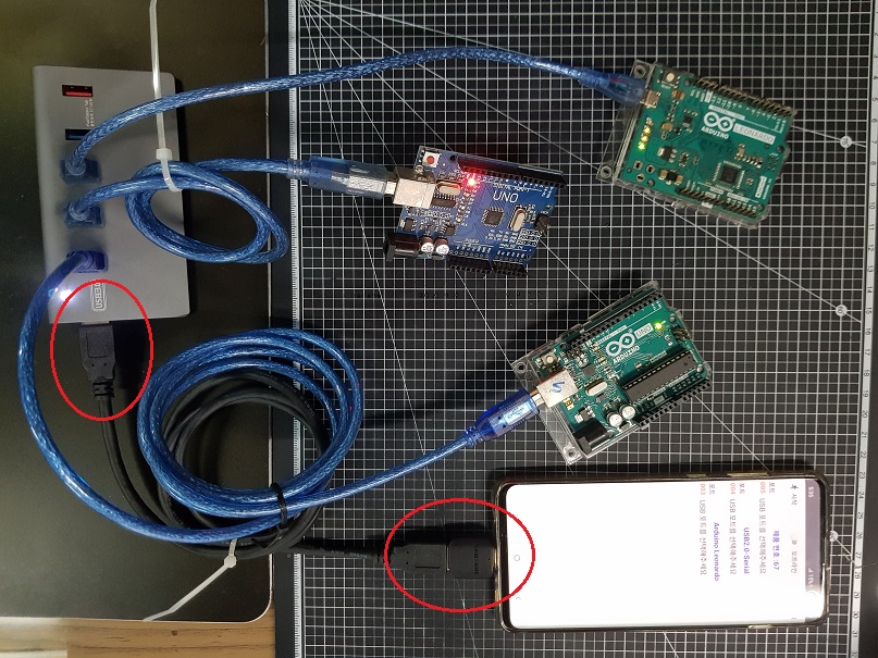 5. IOT 코아 앱이 설치된 스마트폰과 USB 허브를 연결합니다