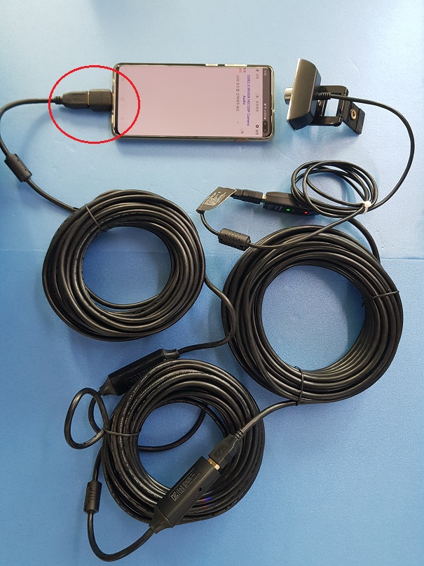 3. 연장( 리피터 )케이블에 OTG 젠더와 USB 카메라를 연결합니다