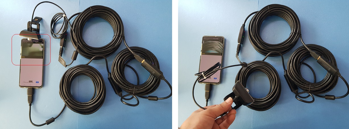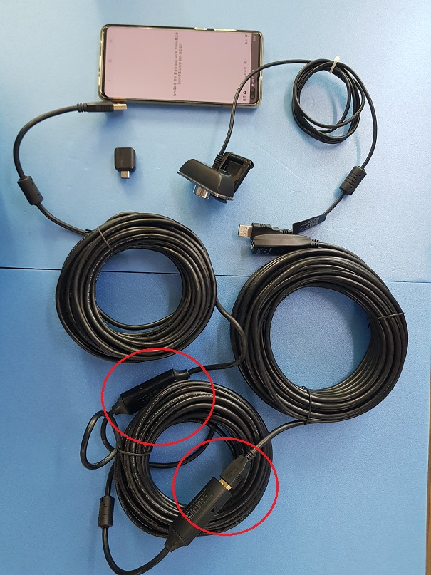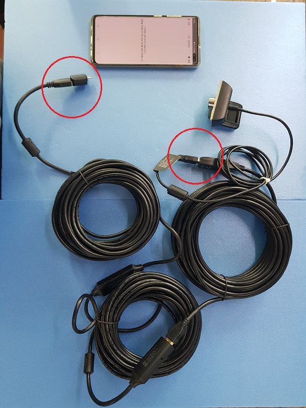 ☆ 본 예시는 스마트폰 전원만을 이용하여 30m 연장( 리피터 )케이블을 연결하였을 때 동작 가능한지를 알아봅니다.