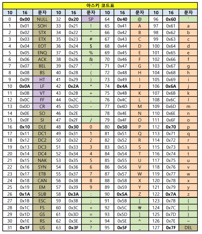 ☆ 보드 BYTE( HEX )타입 "프로토콜" 등록에 필요한 아스키코드 표 입니다.