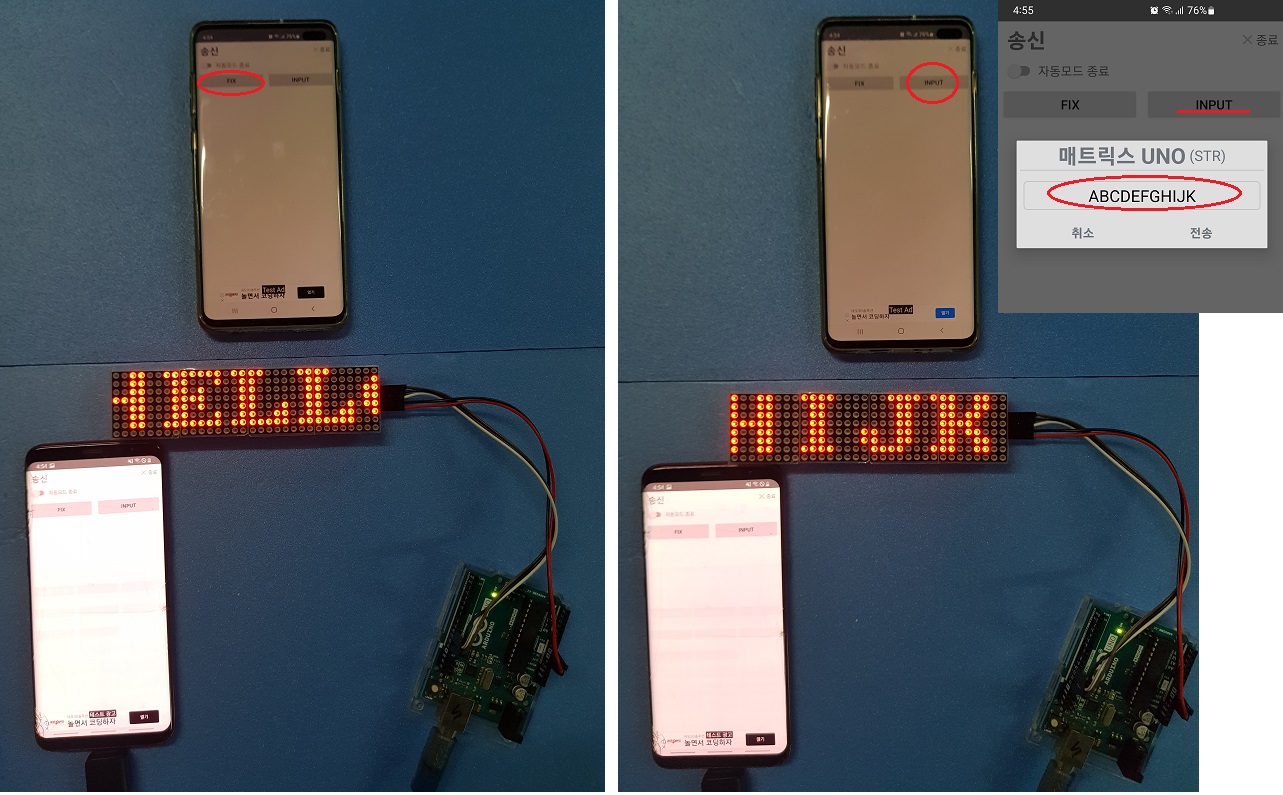 5-5. 실행 뷰에서 "FIX", "INPUT" 버튼을 선택하여 도트 매트릭스가 정상동작하는지 확인합니다