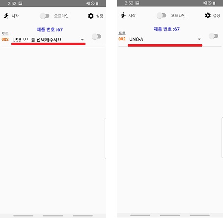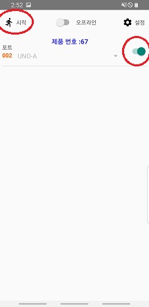 5-2. 토글 버튼을 활성화하여 "UNO-A"보드를 활성화 후, 화면의 왼쪽 상단의 "시작"버튼을 선택합니다