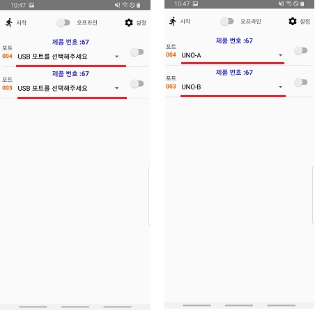 5-1. 시작화면의 "USB 포트" 스피너를 선택하여 등록된 "UNO-A", "UNO-B" 보드를 선택합니다