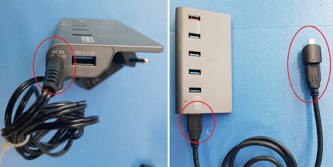 2. USB 허브에 외부 전원, 데이터 케이블, OTG 젠더를 연결합니다
