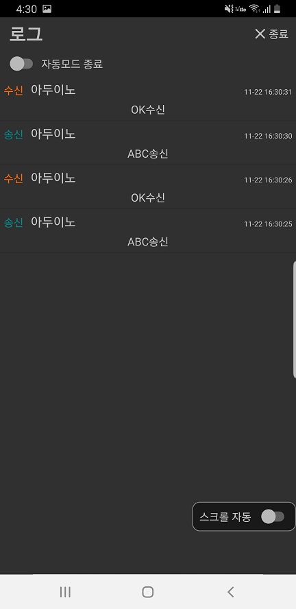 ◎ 화면을 "오른쪽"으로 스크롤하면 LOG 화면을 볼 수 있습니다.