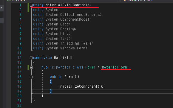 ◎ Android 앱과 같이 다크/라이트 모드를 사용하고 싶다면 Form 생성자에서 MaterialSkinManager를 상속받아서 작업하면 된다고 설명되어져 있으며, 4줄의 코드로 가능하다.( MaterialSkinManager를 사용하려면 using 을 추가해야됩니다 )
