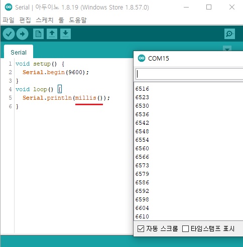 ◎ millis() 를 Serial.println() 함수에 바로 적용 시켰습니다. 이것으로 millis() 사용방법은 끝이라고 보시면 됩니다.