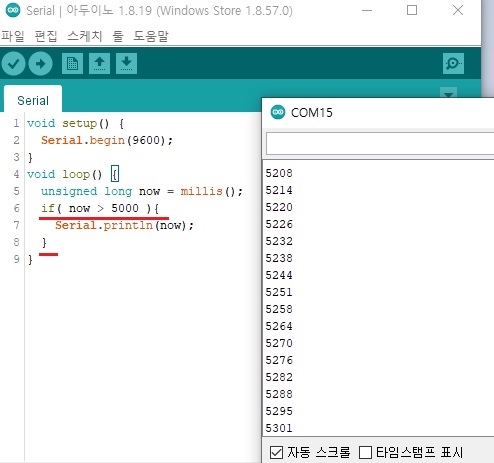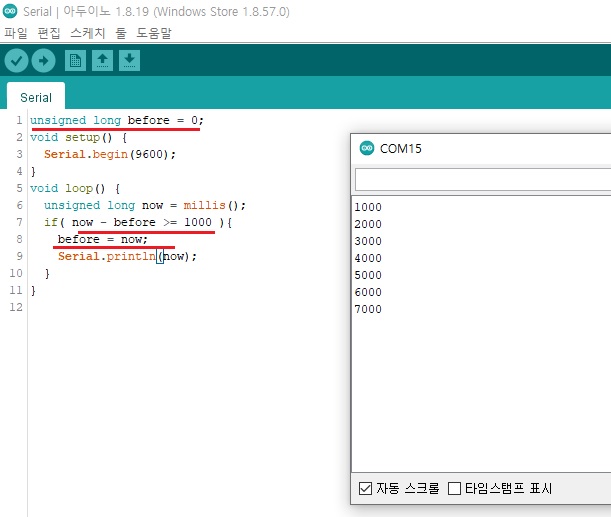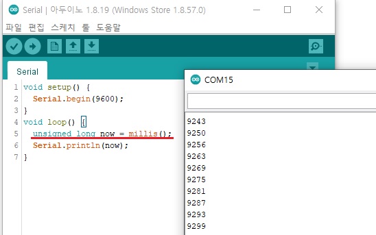 ◎ Serial.println() 함수에 millis()함수의 값이 저장된 now를 넣어줬습니다.
