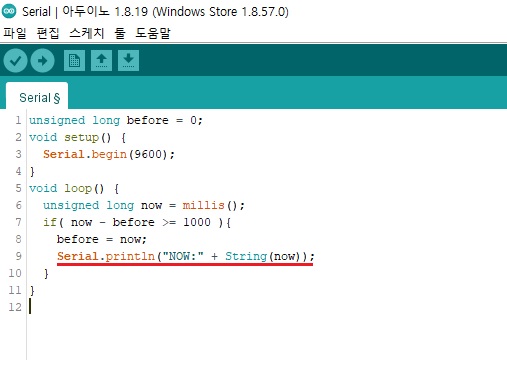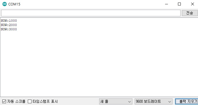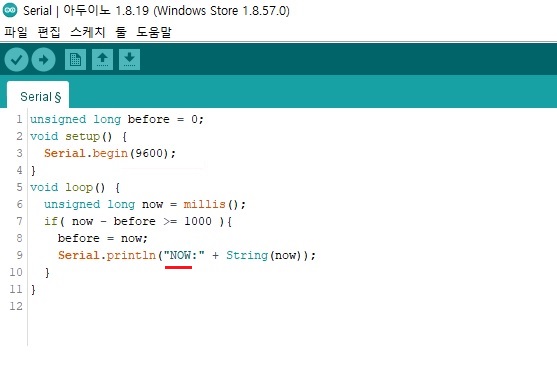 ◎ 시리얼모니터를 이용하여 기존 "현재 시간 : "이 "NOW:"로 변경된것을 확인합니다
