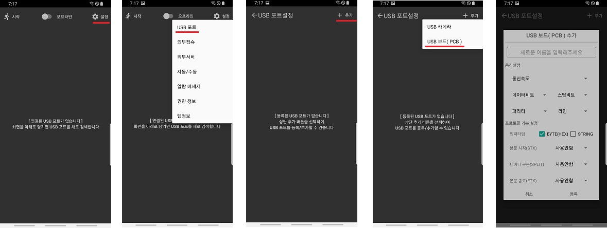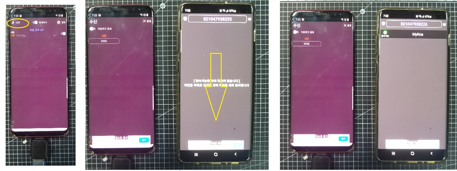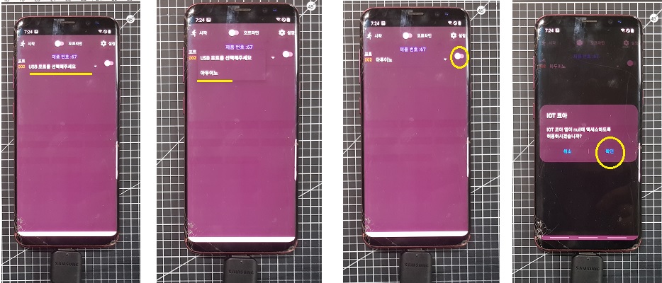 ◎ IOT코아 앱 왼쪽 상단 "시작"버튼을 눌러서 연결된 USB 제어를 시작 합니다