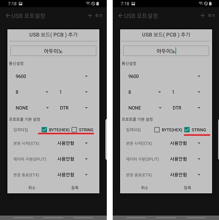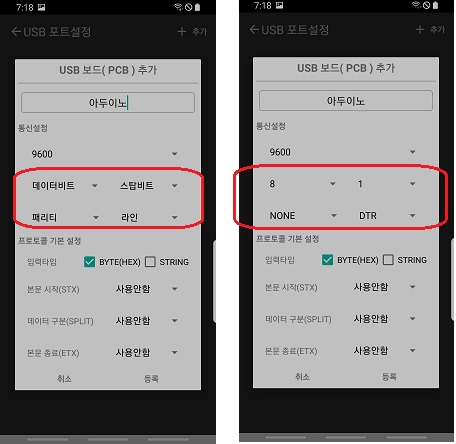 ◎ 나머지 값들은, 아두이노에서 수정하지 않는 이상 오른쪽 사진과 동일한 값으로 설정하시면 됩니다.