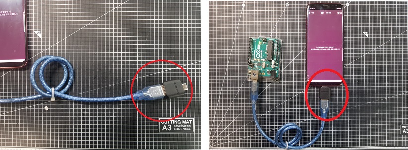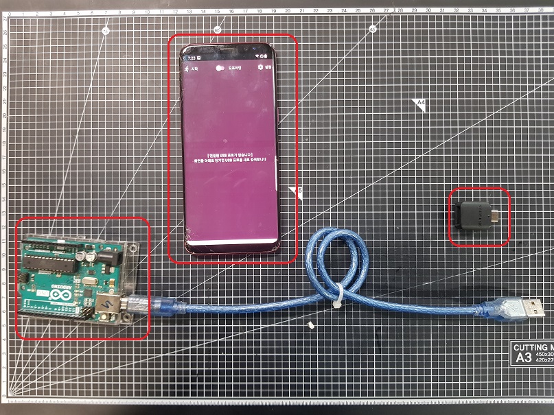 ◎ 예제 소스코드가 "업로드"되어 있는 아두이노 , OTG 젠더, IOT코아 앱이 설치된 스마트폰( 위에서 USB포트, 프로토콜 설정이 되어있는 상태여야 합니다 )