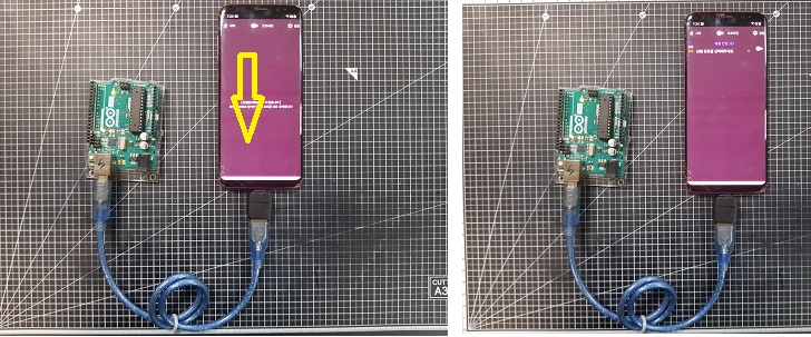 ◎ 3번째 이미지와 같이 버튼을 누르면 "권한"에 대한 메세지가 나옵니다. 이것은 안드로이드에서 "권한"정보를 확인해야되는 조건으로 최초 연결한 경우 권한을 승인해줘야합니다. ( 계속 연결되어있다면, 최초 1번이지만, 아두이노가 분리 된 후 다시 연결하면 안드로이드는 해당 USB를 최초로 인식합니다 )