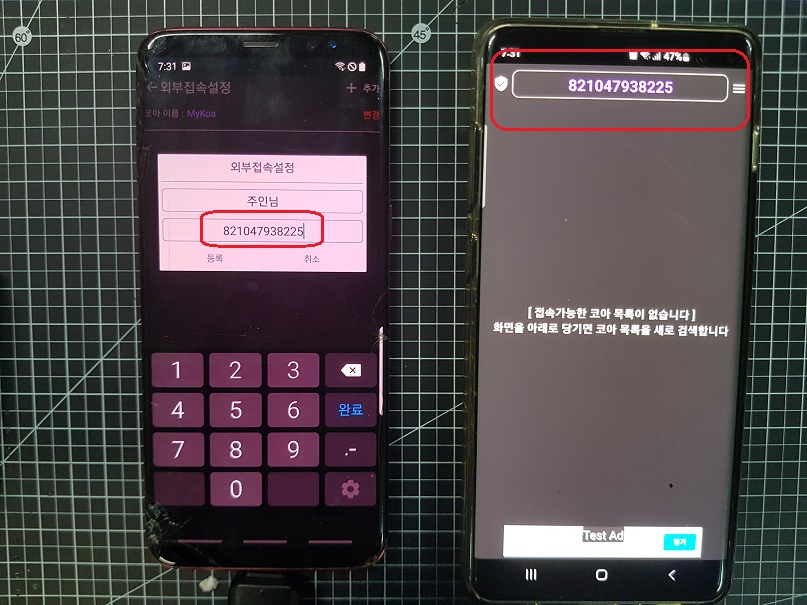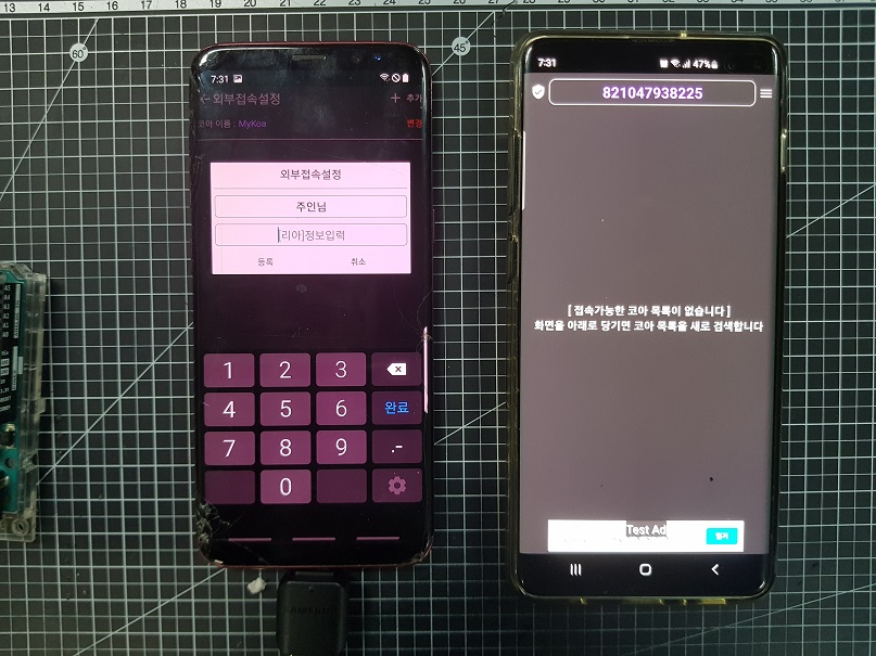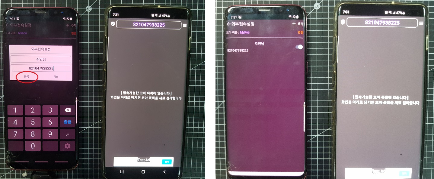 ◎ "등록"버튼을 누르면 완료가 되며, 이제 오른쪽 IOT 리아 앱이 설치된 스마트폰은 왼쪽 IOT코아 앱이 설치된 스마트폰으로 접속이 가능해졌습니다.