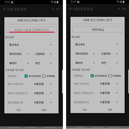 ◎ 이미지와 같이 설정이 끝났으면 "등록"버튼을 누르면, 오른쪽 이미지와 같이 아두이노 보드가 등록이 되었습니다.