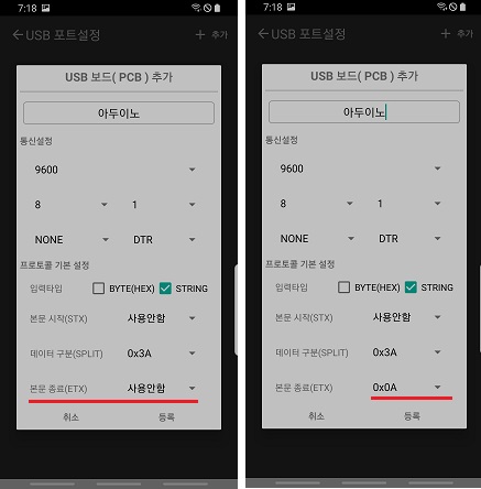 ◎ 본문 종료( ETX )를 0x0A로 설정합니다( 이부분은 필수 입니다 )