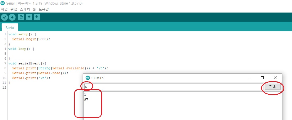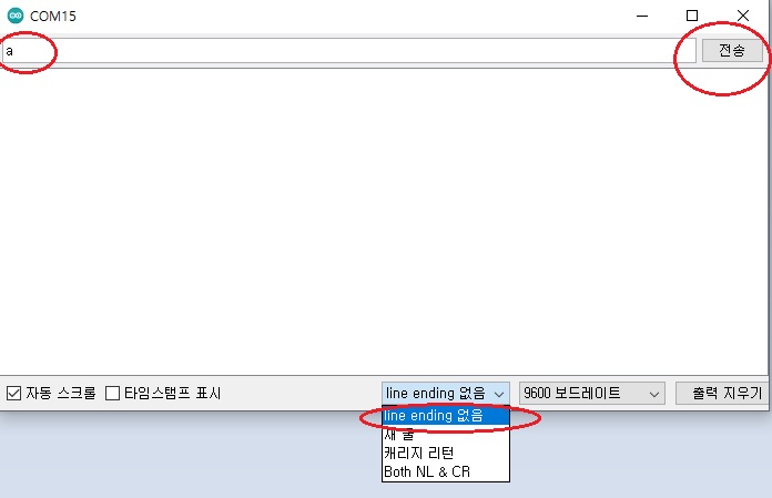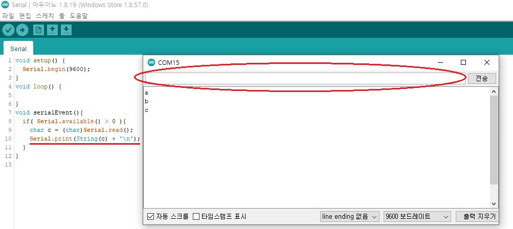 ◎ 시리얼모니터 입력칸(붉은 동그라미)에 abc를 한 문자씩 입력하여 전송버튼을 눌러봅니다.