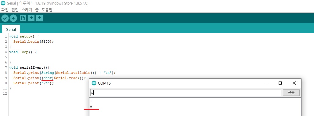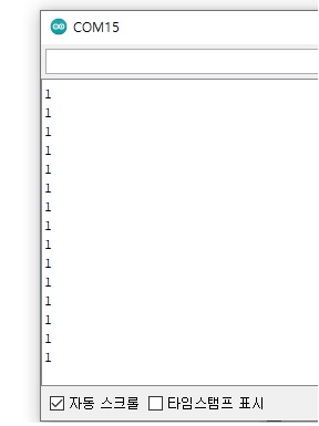 ※ 1이 계속 출력되는 이유는, Serial 수신 바구니에 입력한 'a' 데이터 한개가 담겨있기 때문이며, 바구니에서 데이터를 꺼내거나 아두이노를 리셋할 경우 바구니가 비워집니다.