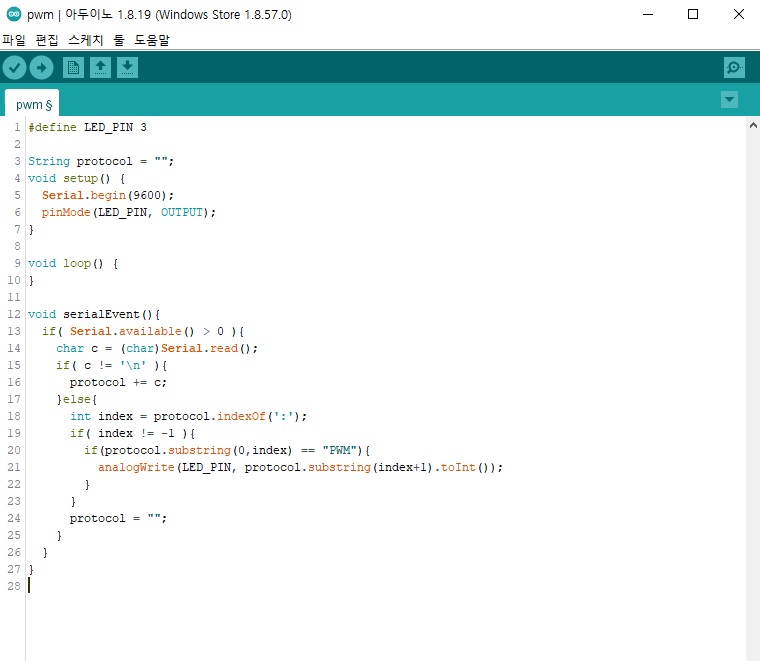 ※ 프로토콜이 "PWM"인 이유는 아두이노 코드 20번째 줄 "PWM"과 비교를 위해서 입니다.( 자세한 내용은 코아[IOT_KOA] 카테고리 중 "보드 프로토콜설정방법"을 참고해주세요 )