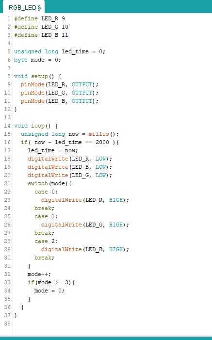 1. 2초마다 LED 색상을 변경해봅니다. 소스코드는 다음과 같습니다
