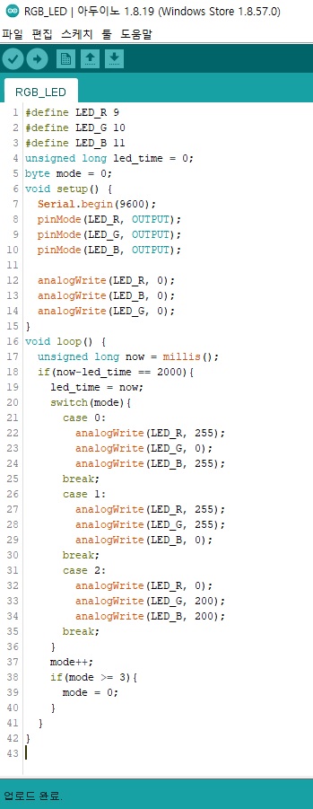 ◎ 22~24, 27~29, 32~34 : 각 핀에 analogWrite() 함수를 이용하여, 0~255 사이의 값을 입력하여 색상별 밝기 출력.